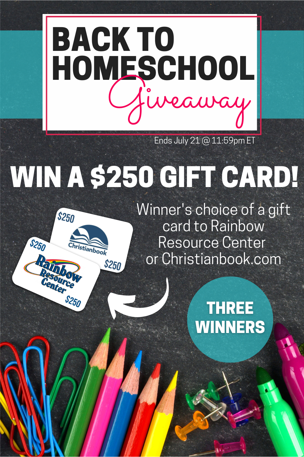 Three people will win a $250 gift card to either Rainbow Resource Center or Christianbook.com – two great places to shop for homeschool curriculum and resources, with the best prices around!!