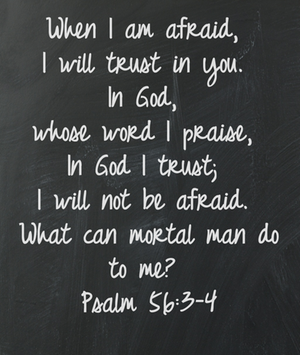 Psalm 56:3-4 “When I am afraid, I will trust in you. In God, whose word I praise, in God I trust; I will not be afraid. What can mortal man do to me?”