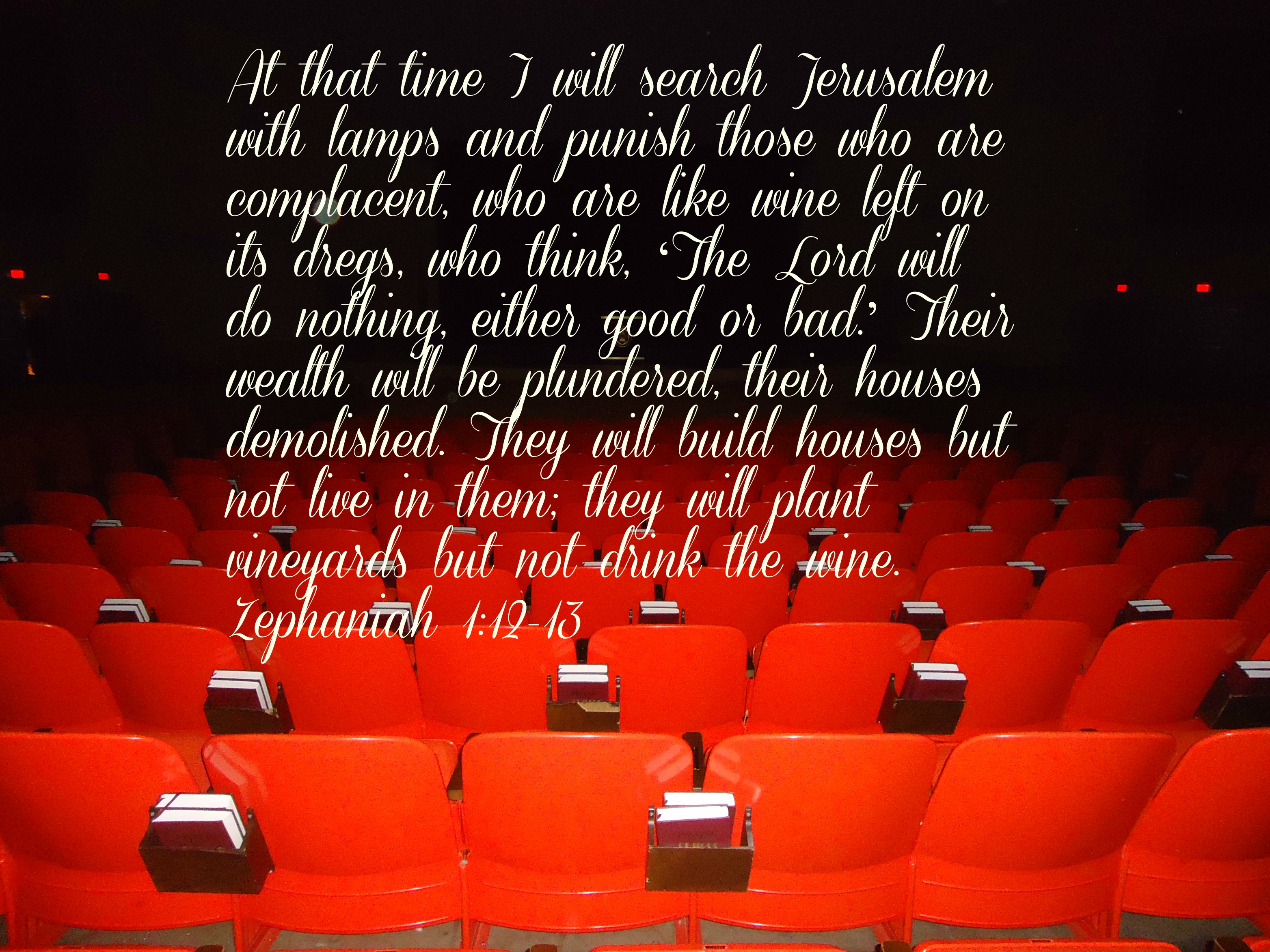 Zephaniah says that men who are compromised with the world and complacent in the kingdom are like “wine left on its dregs” a metaphor for a lack of energy and motion in the pursuit of doing anything worthwhile for the Lord. Why should this attitude exist among God’s people? The answer is given to us that people who allow themselves to become complacent and compromised by the world system really don’t think God is relevant or active in their lives. In short they don’t think God is real or helpful to them. That’s the belief and attitude that fuels the spirit of so many who compromise, grow cold, and drop out of a relationship with the Lord. Please notice those who have no desire for Christ or his Church, and be assured that God knows who they are and he will shine his lamp on them.