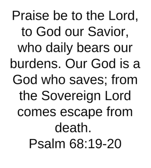 Psalm 68:19-20 “Praise be to the Lord, to God our Savior, who daily bears our burdens. Our God is a God who saves; from the Sovereign Lord comes escape from death.” (NIV)