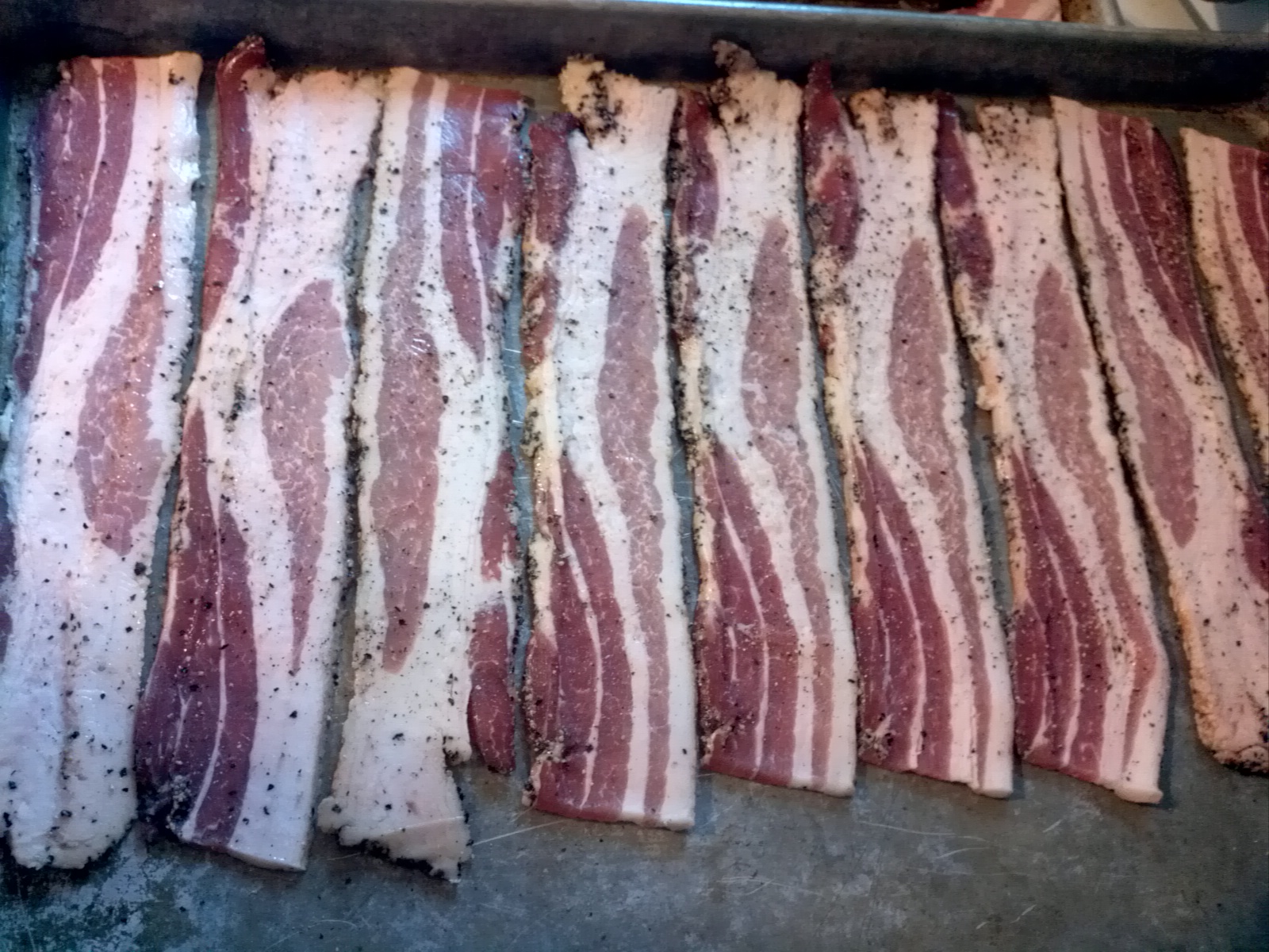 How hard can it be to make peppered bacon? IT ISN'T! Simply take one package of regular thick cut bacon (I tried it on the thin regular cut style but the pepper didn't stick to it as well). Open package of bacon and separate slices on a piece of foil. Using a pepper mill, apply as much pepper as you think it appropriate to both sides of the bacon. Stack the bacon slices and place in a plastic baggie overnight. Prepare are usual.