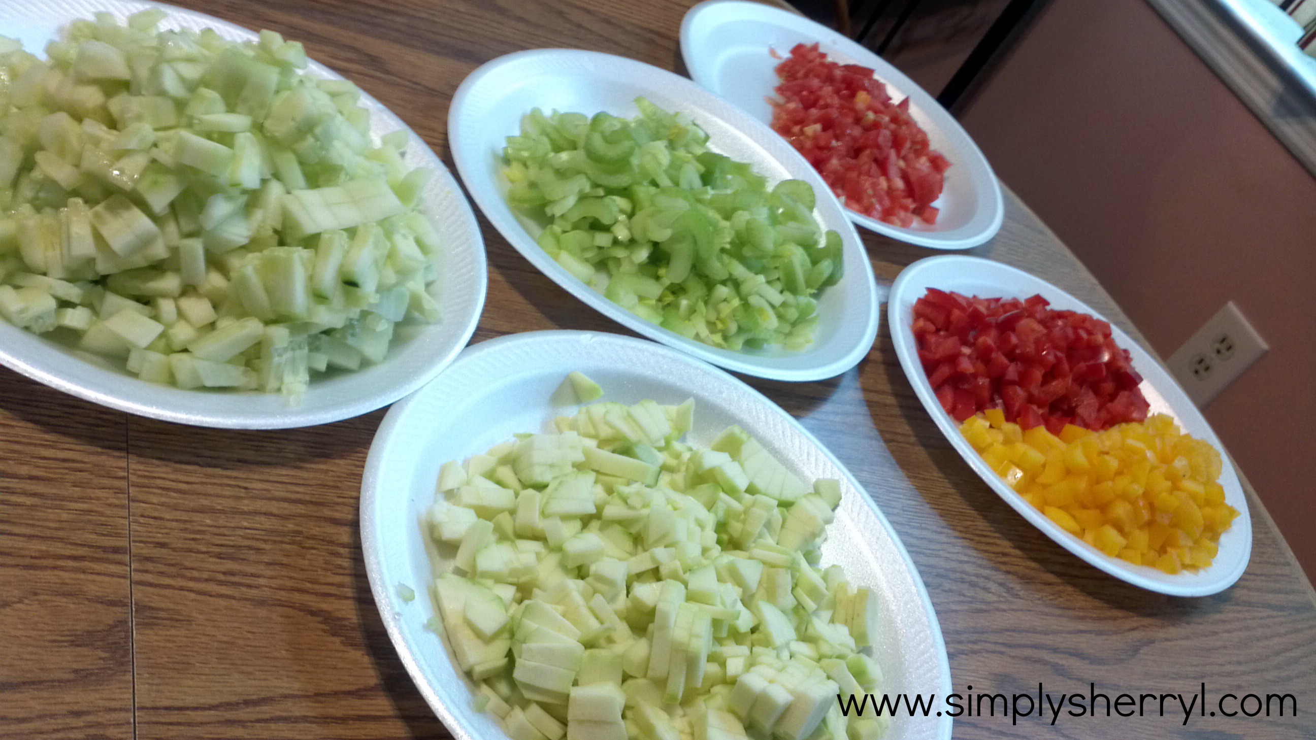 Dice each of the first six items, keeping them separate (to be used as individual garnish later)