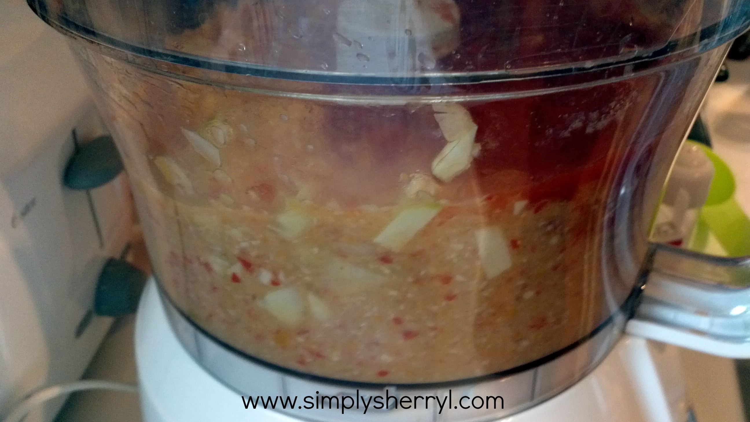 In food processor, add Garlic, Olive Oil and Vinegar – blend well