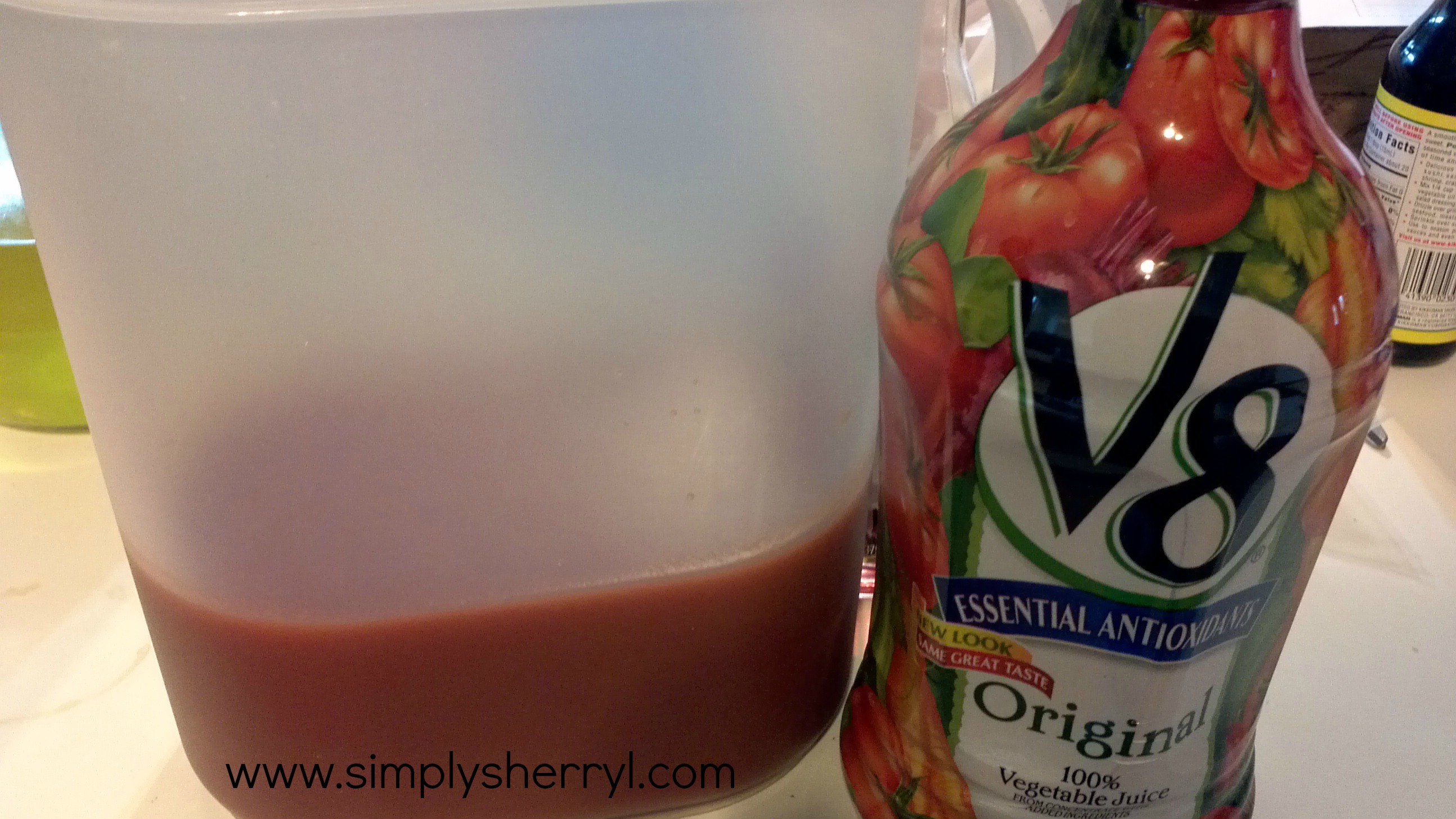 Slowly add the bottles of V8 Juice or Tomato Juice, stirring well.
