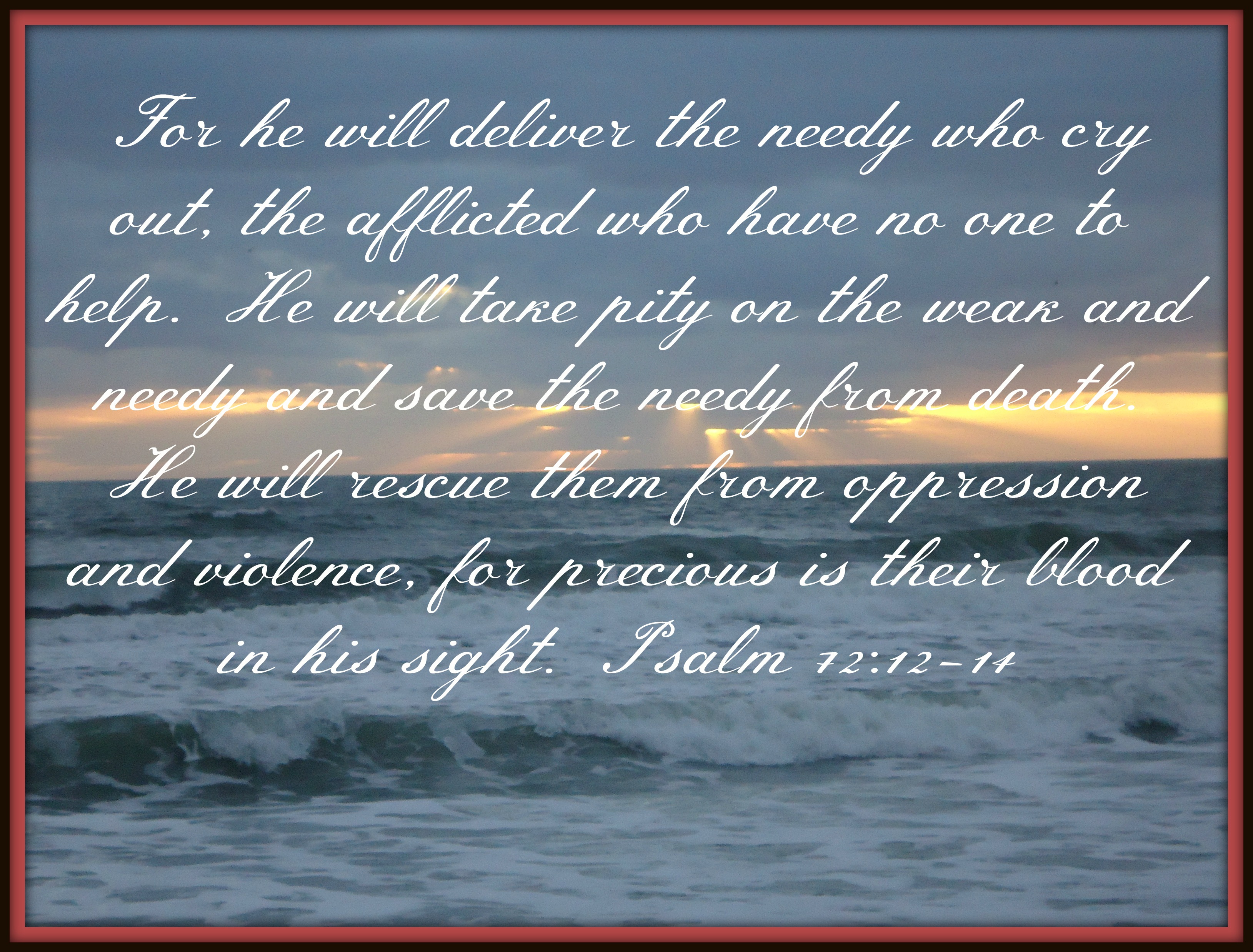 Psalm 72:12-14 “For he will deliver the needy who cry out, the afflicted who have no one to help. He will take pity on the weak and needy and save the needy from death. He will rescue them from oppression and violence, for precious is their blood in his sight.” (NIV)