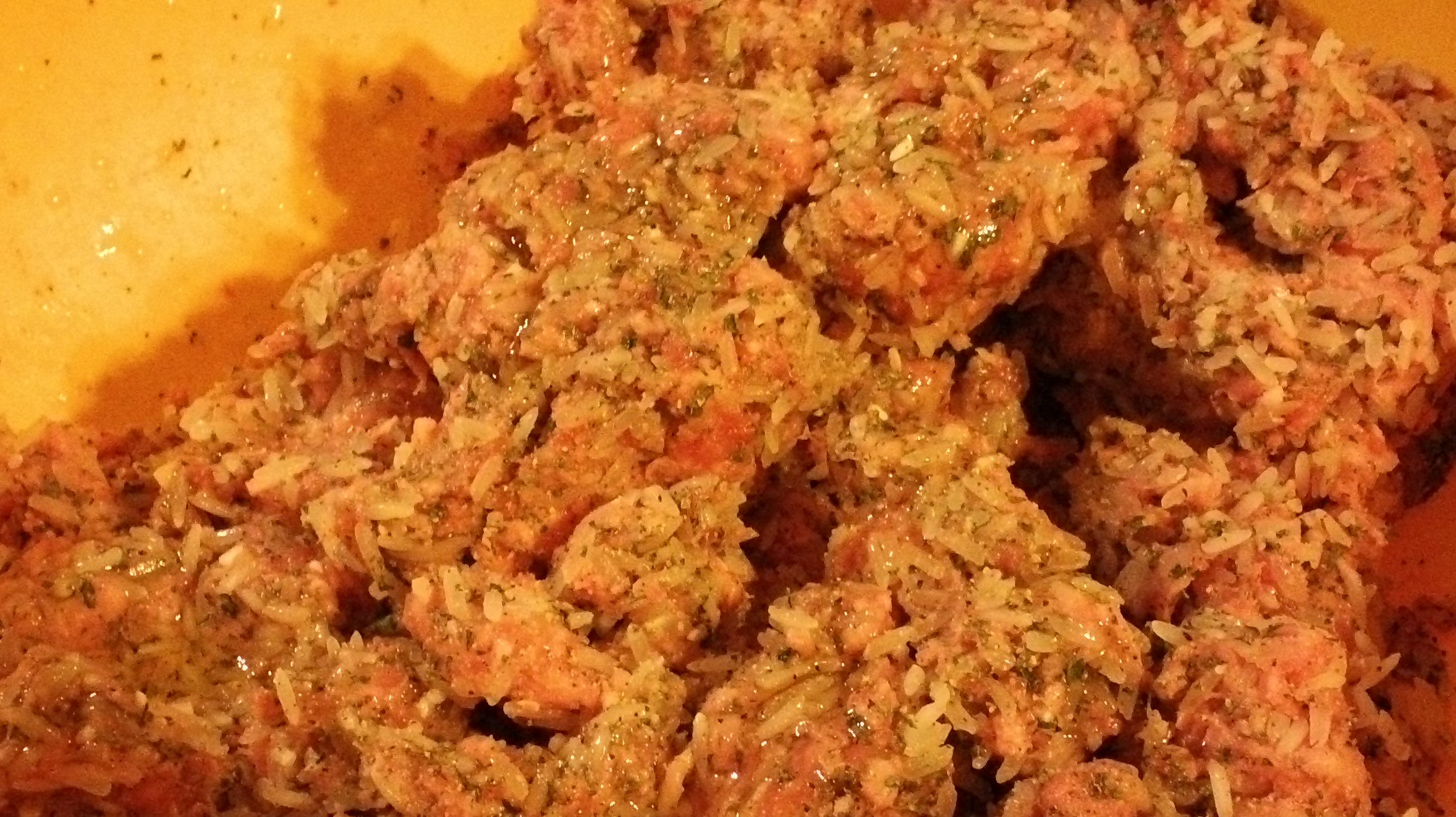 In another large bowl, combine the meat, onion, rice, dill, parsley or cilantro (or combo of both), oil, salt and pepper. Mix well. This usually requires getting your hands in the mix but can be done with a large spoon and elbow grease.