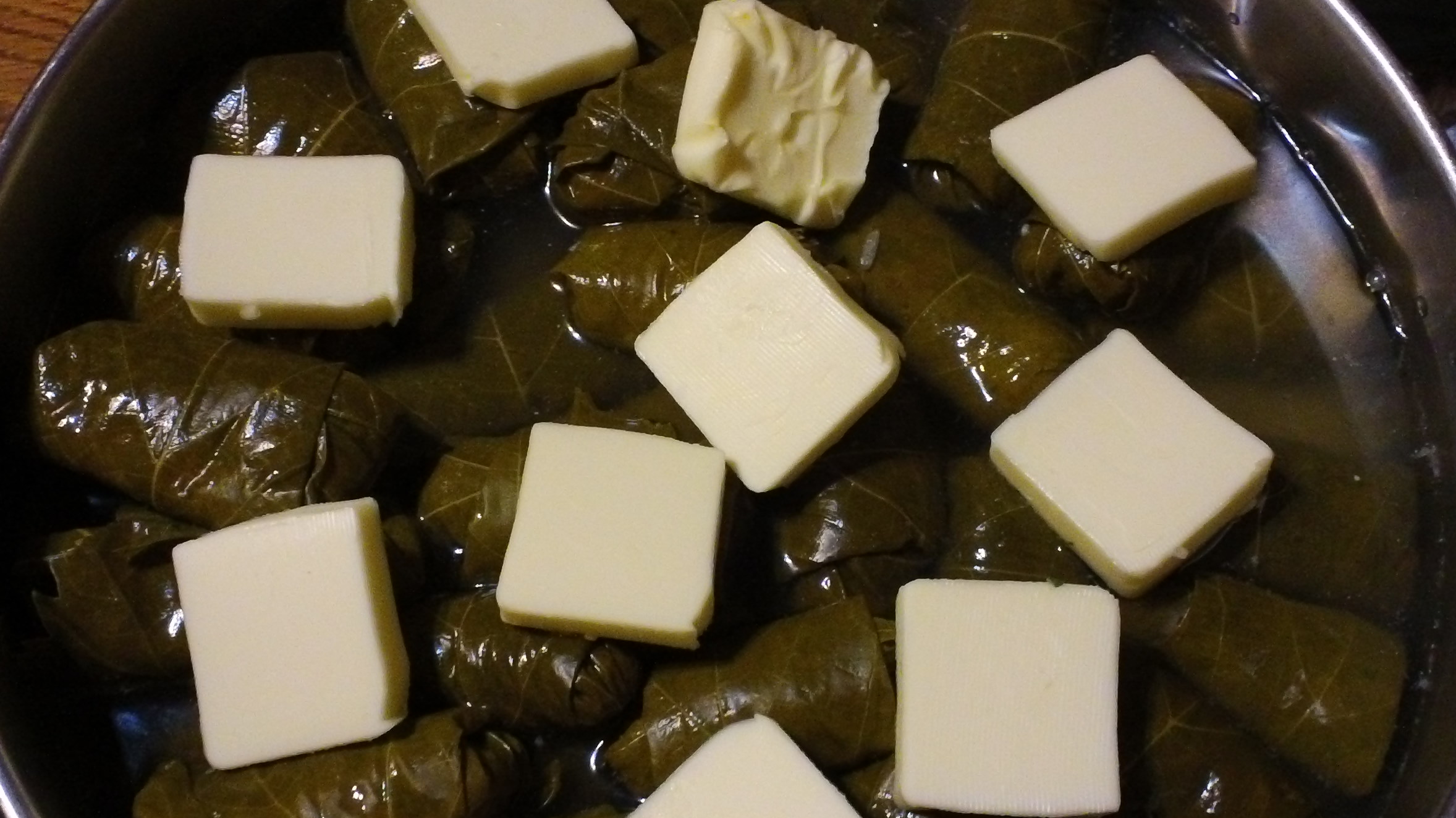 When finished rolling leaves, pour broth and lemon juice over leaves. Fill with water until the leaves are completely covered. Slice one stick of butter and dab over leaves. Weigh the grape leaves down with a small dinner plate turned upside down