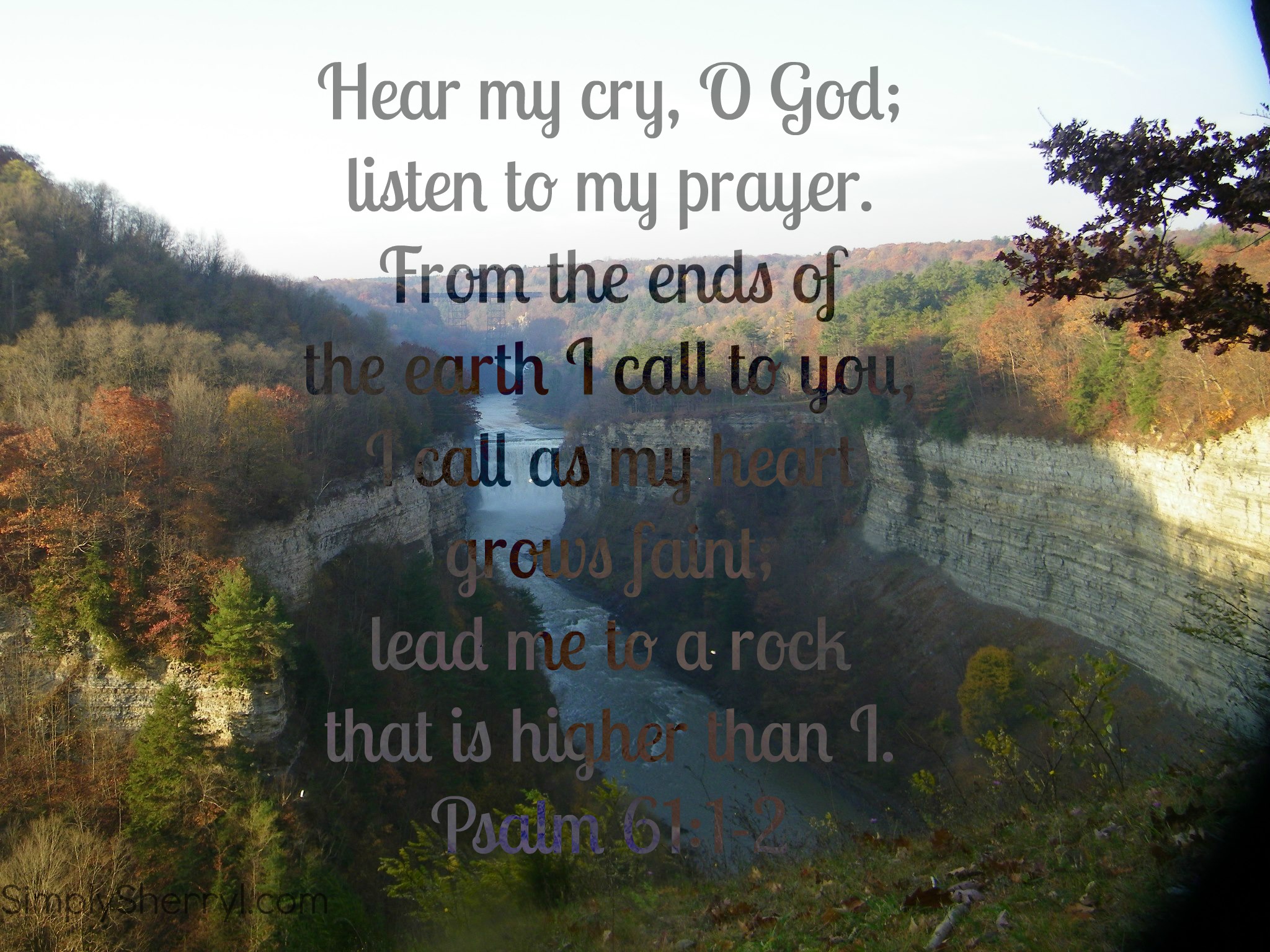 Psalm 61:1-2 “Hear my cry, O God; listen to my prayer. From the ends of the earth I call to you, I call as my heart grows faint; lead me to a rock that is higher than I.” (NIV)