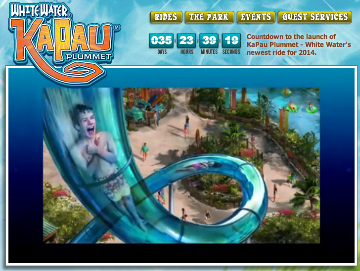 KaPau Plummet, coming Spring 2014, will feature two dueling 245-foot slides, each launching riders from a drop-floor into a 70-degree plunge, exceeding the thrills of any water ride ever built at White Water, the 13-acre tropically-themed Branson water park. Those brave enough to dare the drop will experience a heart-pumping thrill beginning in an encapsulated slide atop a 40-foot tower. This breath-taking attraction will send you free falling at 26 feet per second before you make your final splash! Be one of the first to dare the drop in 2014 at White Water!