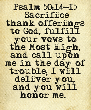 Psalm 50:14-15 “Sacrifice thank offerings to God, fulfill your vows to the Most High, and call upon me in the day of trouble; I will deliver you, and you will honor me.” (NIV)