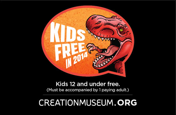 As part of our 2013–2014 theme “Standing Our Ground—Rescuing Our Kids” (Galatians 1:4), we have decided to do something very special to help teach children the truth concerning the Bible: For the entire coming year, January 1 through December 31, 2014, we are going to allow all kids who are 12 years old and under to come to the Creation Museum free of charge! The only stipulation is that the children must be accompanied by at least one paying adult.* (Kids have to be accompanied by an adult anyway in the museum.) I’m sure you are as excited as we are about this wonderful new outreach.